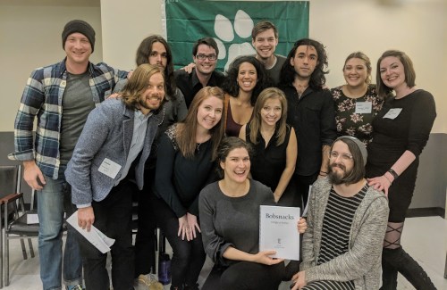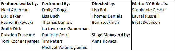 Bobsnacks- A Night of Stories was an early exhibition of new work by the Tantrum East Theatre. A night of excerpts presented publicly from works-in-progress by playwrights and writers from the Ohio University Bobcat community. Writers were given 10-15 minutes to present a sample (or a Bobsnack, if you will) of a project they are currently working on to be read publicly by professional actors, and the chance to seek out feedback from those in attendance.